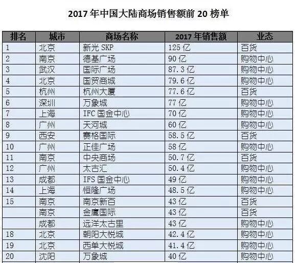 我们进而查到了一个中国商场年销售额排行榜,发布机构是商业地产咨询公司睿意德,数据是2017年的,刚刚过去的2018年,数据可能还没来得及出炉。