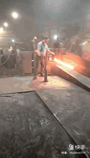 特殊的工作节奏,只有轧钢工才有。烧过的钢从加热炉出来的时候,是耀眼的橙红色,轧钢工用工具迅速拉动,在接近地面的空气里划出短暂的金光,放进另一架机器继续轧,发红的钢有近千摄氏度,每一次操作都要小心。小夏吃过亏,右小腿还留着一块疤,这是走神的代价。