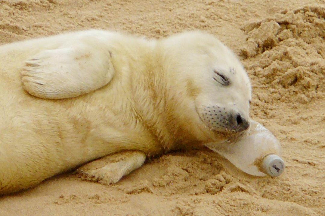 诺福克,出生刚一天的小海豹,枕着塑料瓶安睡; JOHN EVERED/KNS NEWS