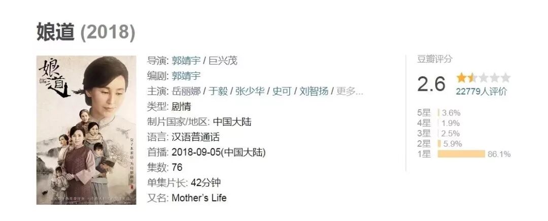 - 来源:桃花马上石榴裙(ID:taohuama2015) 01 ▼ 刚刚过去的2018年,有一热搜神剧《娘道》。 2.6分的差评,基本无关演技和制作,而是因为三观。 女人地位卑贱,毫无尊严,无底线牺牲是