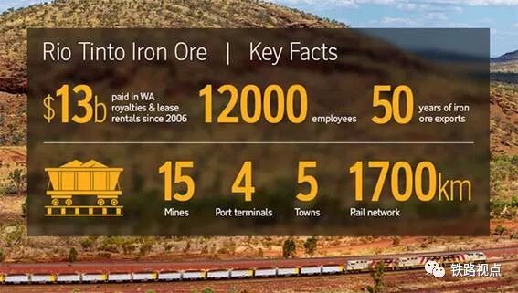 力拓集团拥有约200台柴油电力机车,将铁矿石从16座矿山运往4个港口码头。这些列车往返的平均行程约为800公里,平均行程周期(包括装载和倾卸)约为40小时。