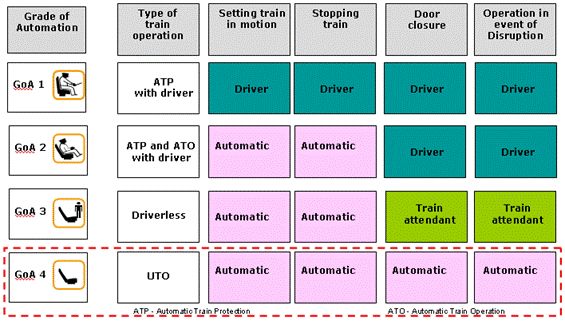 根据IEC62267标准,依照人与系统对列车运行控制的不同水平以及列车运行自动化的不同程度,将铁路自动驾驶分为5级(GoA0~4)。其中,GoA0~1级属于人工驾驶非自动运转方式,GoA2级属于半自动运转方式,GoA3级属于有人监视的自动驾驶(DTO),GoA4级属于无人监视的自动驾驶(UTO)。