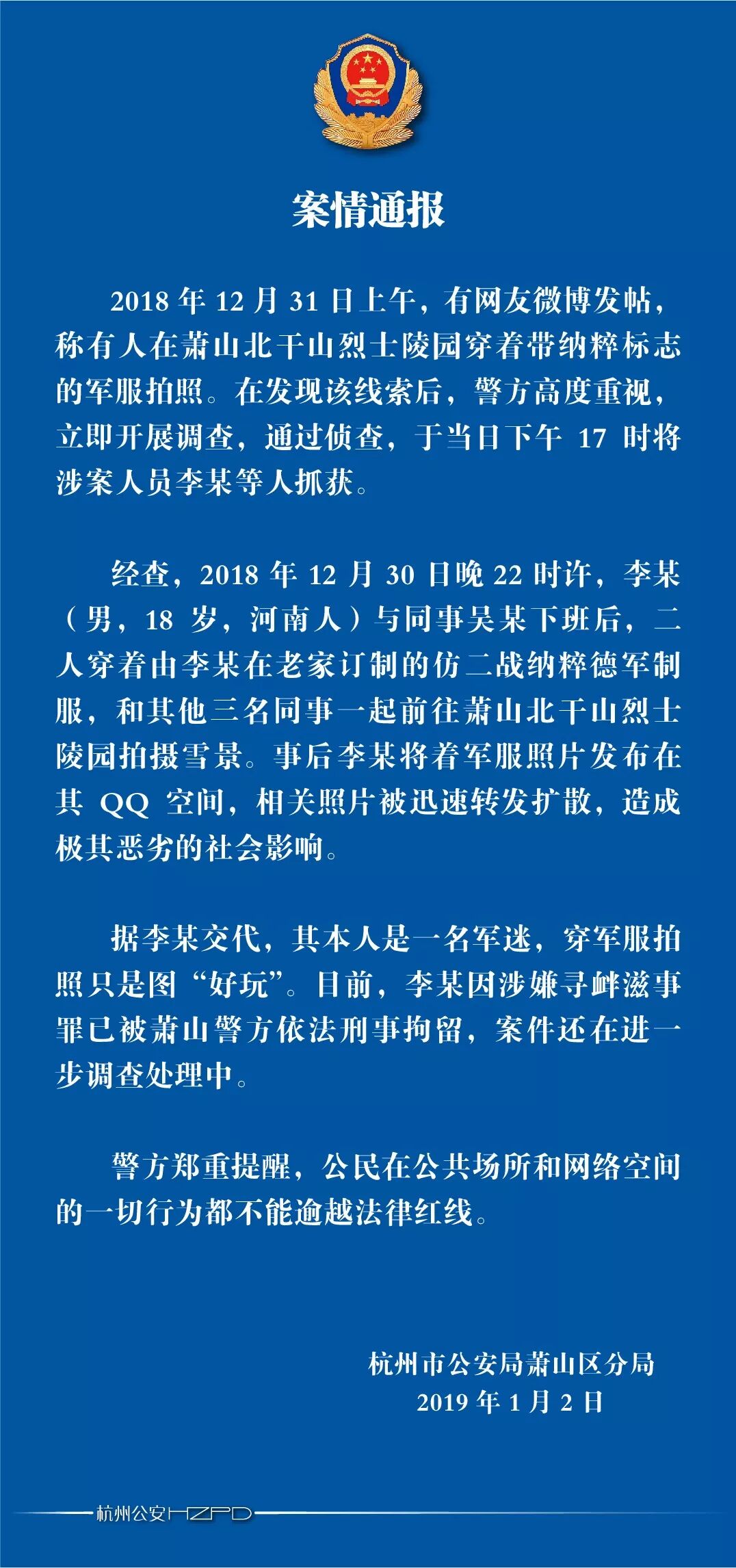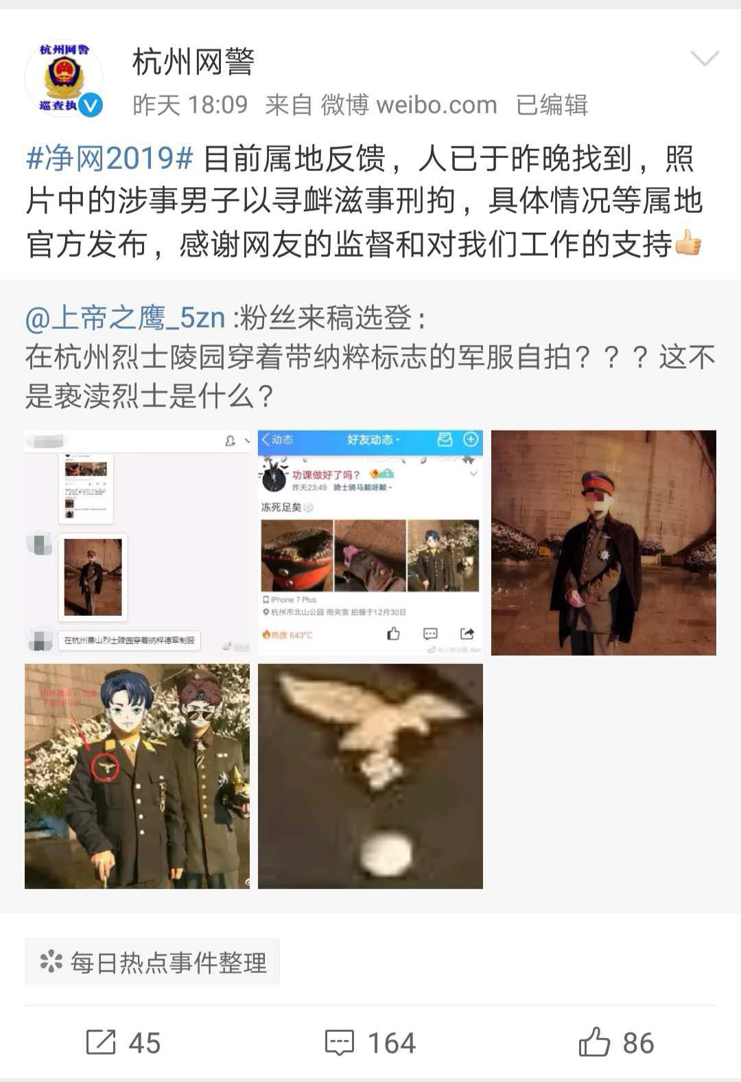 - 2018年12月31日,网友爆料,有人在杭州烈士陵园穿着带纳粹标志的军服自拍。对此,杭州警方高度重视,第一时间进行调查。 @杭州网警 1月1日回应:目前属地反馈,人已于昨晚找到,照片中的涉事男子