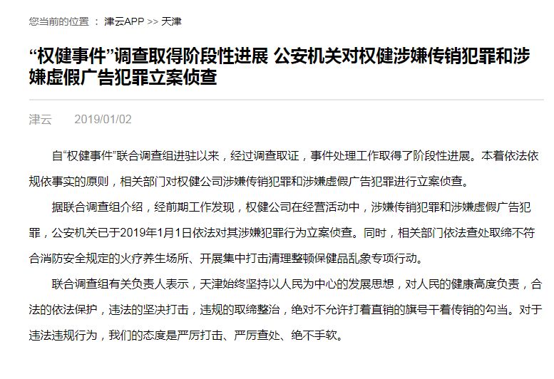 自“权健事件”联合调查组进驻以来,经过调查取证,事件处理工作取得了阶段性进展。本着依法依规依事实的原则,相关部门对权健公司涉嫌传销犯罪和涉嫌虚假广告犯罪进行立案侦查。