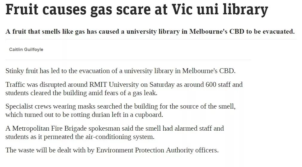 墨尔本大学毒气恐慌疏散600人,后来发现是榴莲太臭