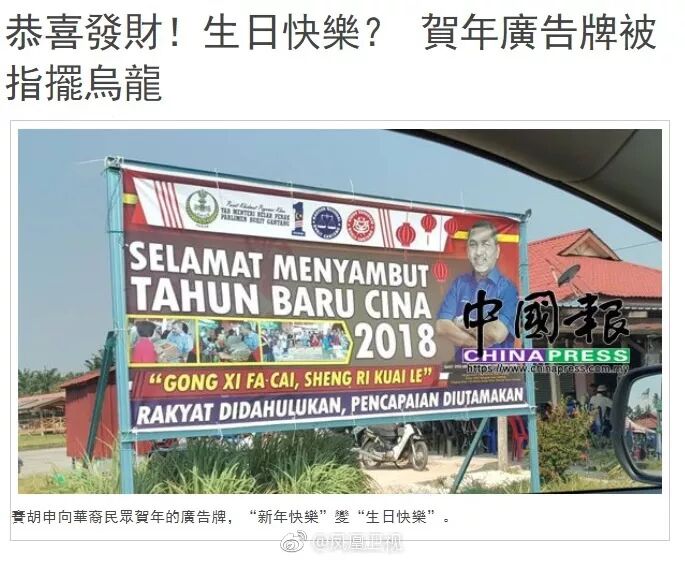 马来西亚为向华裔贺新年:恭喜发财,生日快乐!