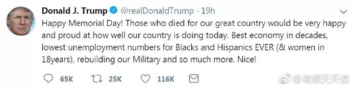 美国国殇日,特朗普推文:“阵亡将士纪念日快乐!”