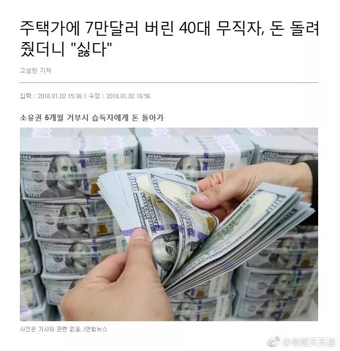 韩男子捡7.2万美金交警局,失主拒收回:我扔的