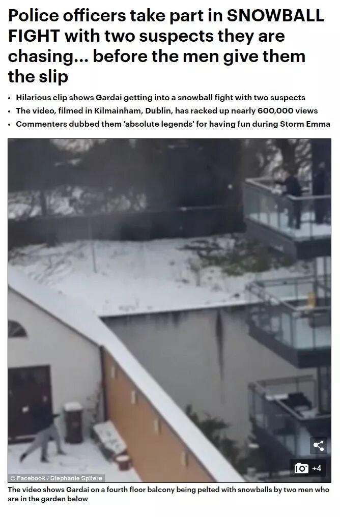 爱尔兰警察抓贼竟和贼打起了雪仗,打完以后贼跑了