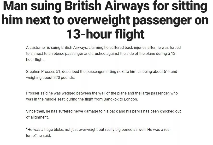 安排300斤超重人士坐身边,挤着飞13小时骨盆损伤,男子怒告英航