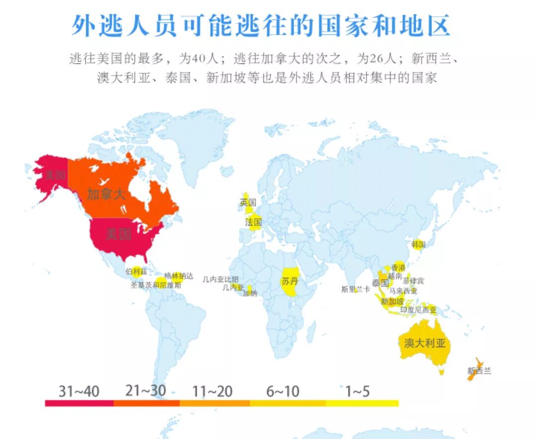 从“百名红通人员”逃往的国家和地区看,最多的是美国,有40人;其次为加拿大,有26人;此外,新西兰、澳大利亚、泰国、新加坡等国家和地区,人数也较多。