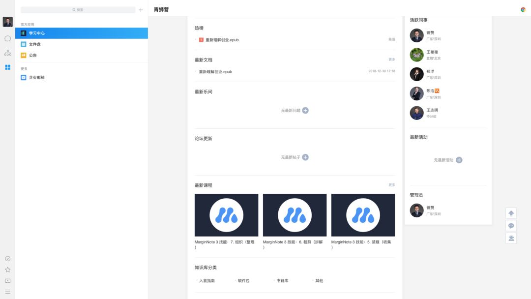 同样的道理,小鹅通是款一流的知识付费类的产品,适合所有的知识付费类创业者。但,青狮营的属性决定了,小鹅通仅仅是一个过渡。当我发现,企业微信工作台可以嵌入一个强大无比的社区系统(包括知识库、课堂、论坛、活动……)时,那一刻,我知道,这是我要的。