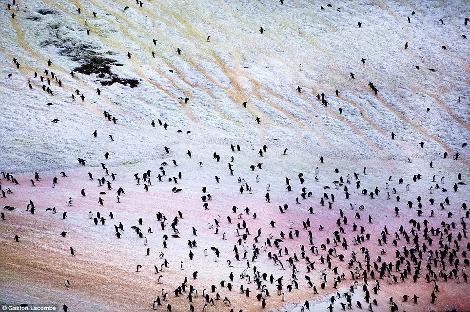 往返于海边和陆地的阿德利企鹅群,以及遍地粉红的粑粑。图源:Gaston Lacombe