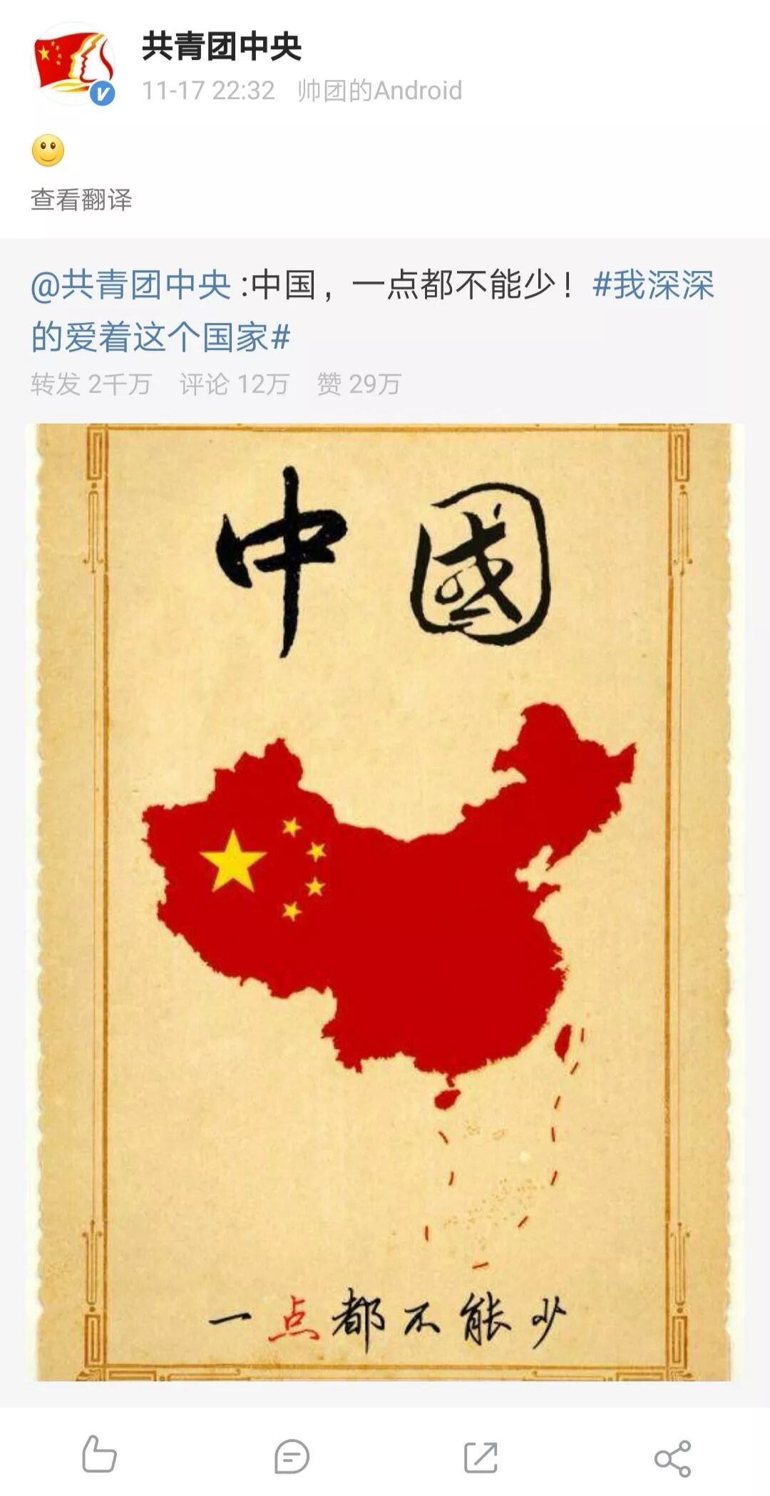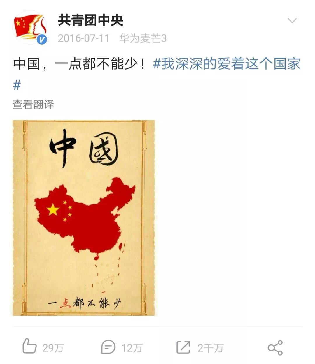 2016年,当荒唐的南海仲裁案闹剧出现的时候,微博@共青团中央 第一时间发声:中国,一点都不能少!从而掀起了全网抵制的热潮。