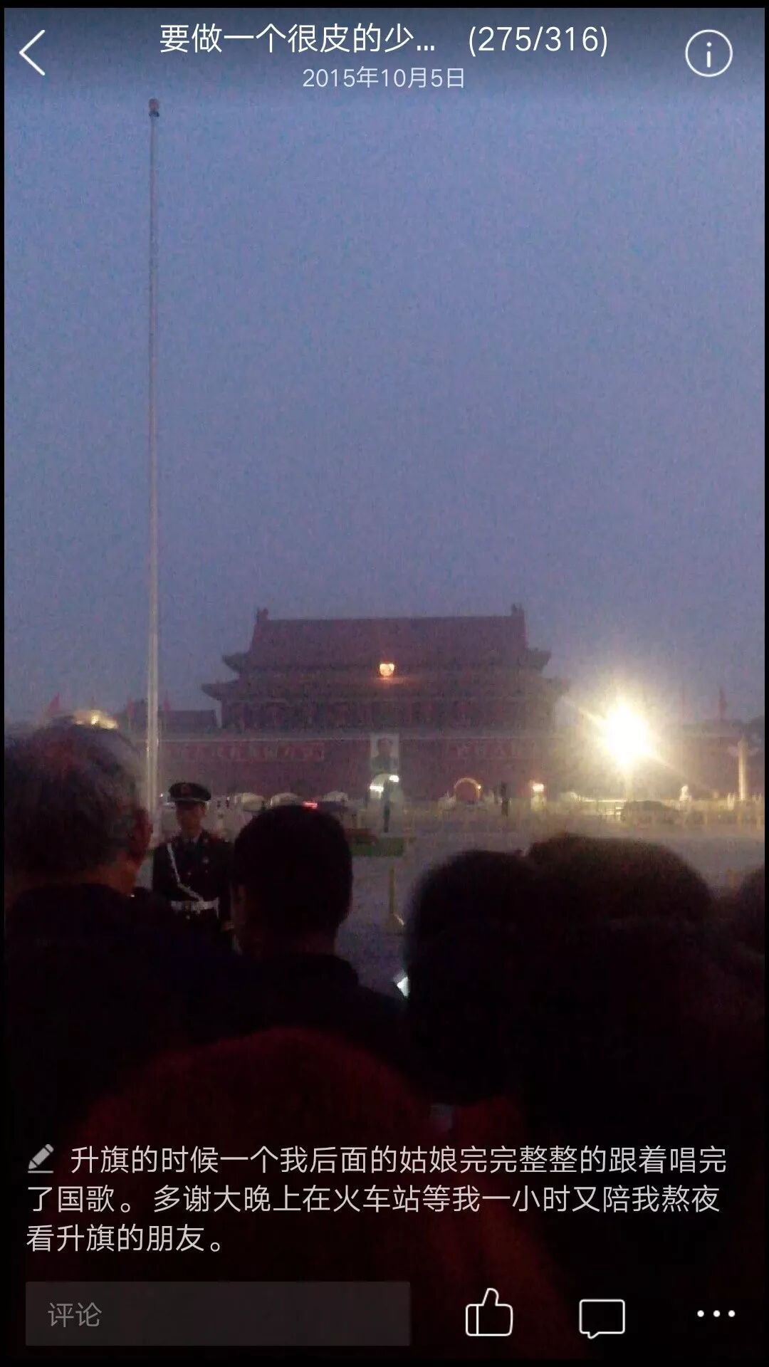 15年国庆自己在寝室待着无聊,订了开往首都的车票,看了人生第一场天安门升旗仪式。