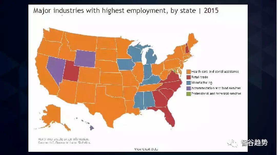 2015年美国的制造业(蓝色部分)已经很少:
