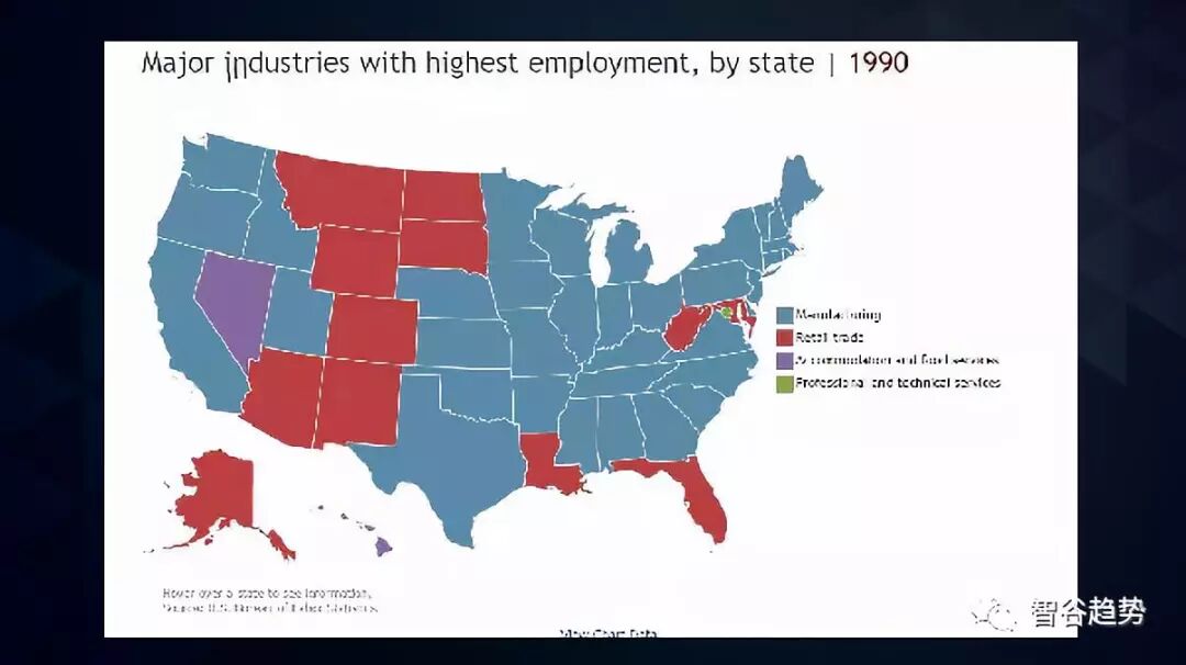 1990年美国是制造业大国(蓝色部分):