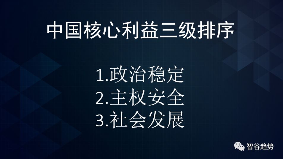 这就对了,政治逻辑几十年没有变。这块不展开。只说一点,中国的核心利益是有排序的: