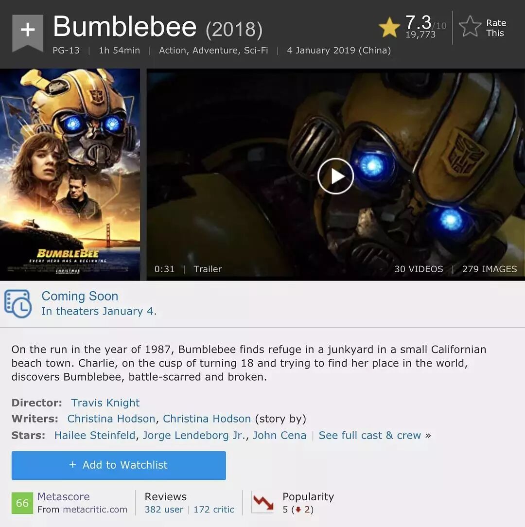 虽然是首度执导真人电影,但奈特导演丰富的动画制作经验,赋予了《大黄蜂》迥然不同的新生机,不再只是毫无逻辑的机械大乱斗,80年代复古元素的运用,以及少女成长teen movie的成功移植,为这部外传电影带来了全系列的最佳口碑——imdb 7.3分和mtc 66分对《变形金刚》系列而言无疑是一次口碑大回春!