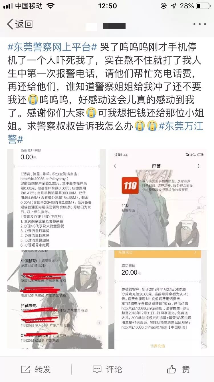 “我平时是一个很‘丧’的人,那天自己很伤心,也很害怕,都不敢想象110真的给我充话费了。”小窦说,在这座陌生的城市里,她感受到了来自陌生人的温暖,“真的很感动,当时我给我朋友说的时候,我都感动得又哭了一次。”