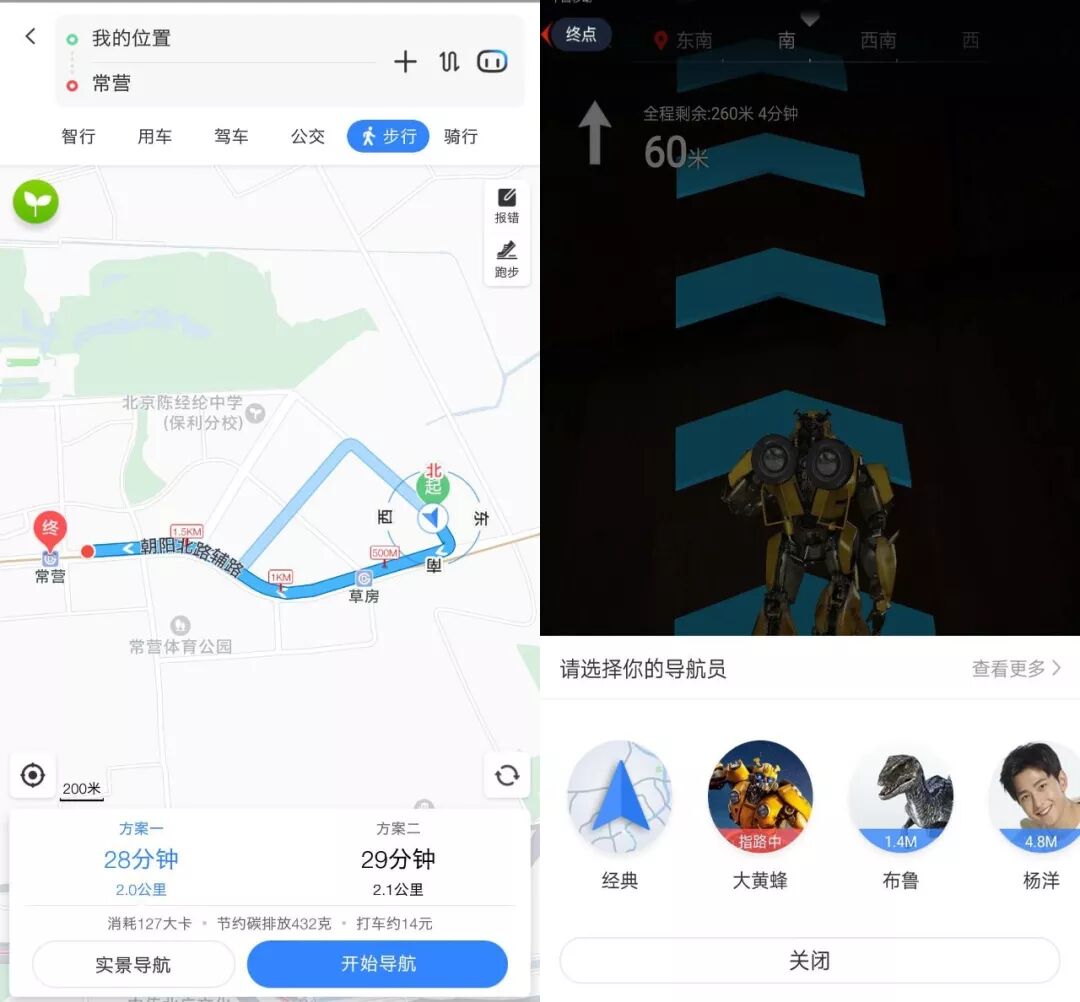 选择步行导航时,在下方的实景导航里选择大黄蜂作为你的导航员。想去哪里,交给大黄蜂就行了。和儿时的英雄在真实生活里相遇,想想就很有趣。