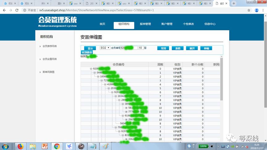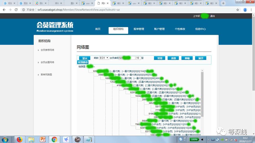 权健400电话确认的其会员管理系统网址www.usapabgxt.shop中的界面,与原权来百货的界面一致,图为10级会员组织结构图示局部截屏(应账号提供人要求遮盖姓名及具体账号信息,截屏时间:2018年12月27日) 截屏:程维
