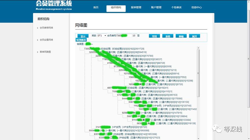 此会员结构图中,还有诸如DO2、DT1等字样的选项。这些会员及店铺负责人称,这一代码是每周的时间代码,如某年某月第一周为DT1等。该网络结构图的“会员安置网络”,则可更直观地显示网络层级图,而且可以突破其他界面最多只能显示10层会员网络结构层次的结构图的限制。《等深线》记者在此网络结构图中,最多能看到11层。