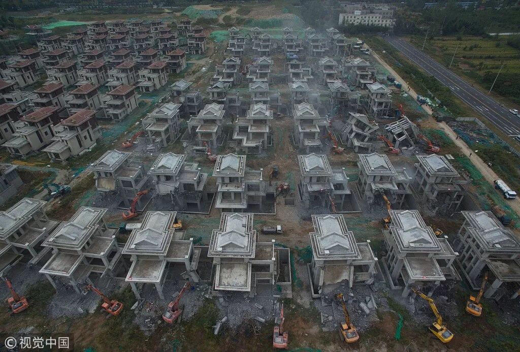 2018年9月13日,西安,59台破拆机连续撞击着别墅的主体墙面,一排排别墅的主体结构逐渐被拆除。7月底开始,陕西省秦岭北麓西安境内展开了违建别墅专项整治行动,大量违规别墅逐步被拆除。