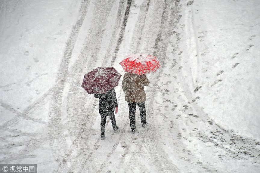 2018年12月28日,行人在山东省烟台市福山区街头冒雪出行。