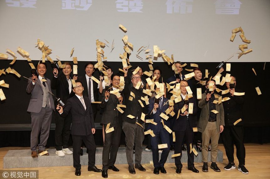 2018年8月27日,香港, 电影《无双》发钞发布会。图为周润发、郭富城、廖启智、孙佳君、杨受成。