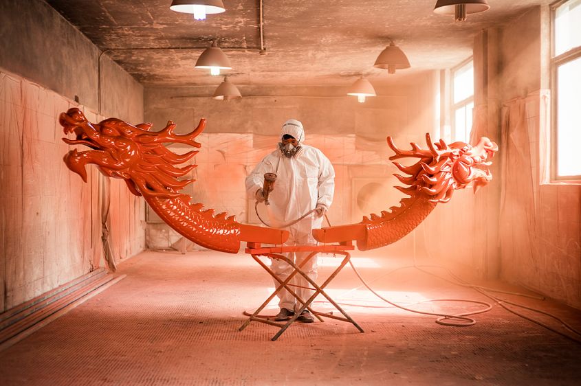 2018年3月23日,浙江杭州,千岛湖的一龙舟造船厂内的工人正在制作龙舟。