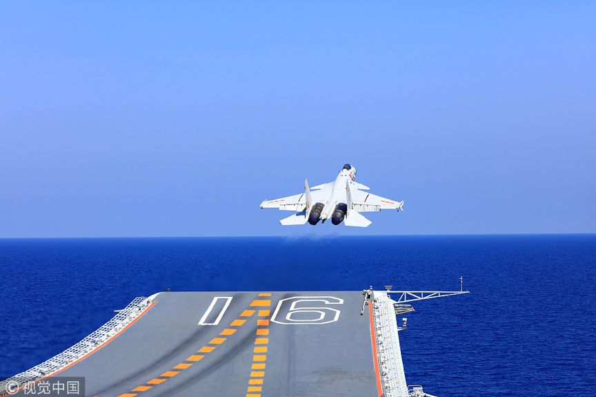 2018年4月15日,海军航母编队在南海某海域开展实兵对抗训练,图为歼-15舰载战斗机在辽宁舰滑跃起飞。