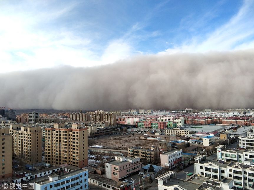 2018年11月25日,甘肃张掖沙尘暴来袭,远观“沙墙”遮天蔽日。