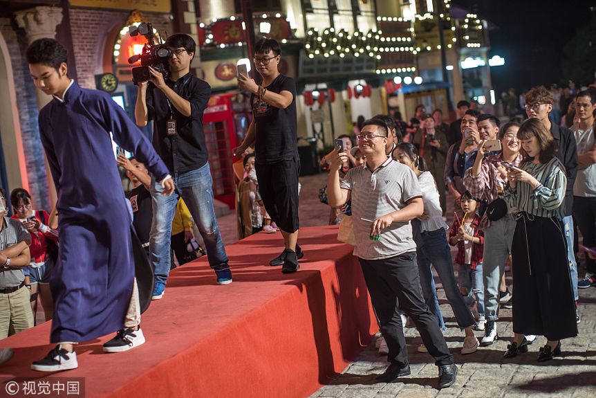 一个维权节目的采访视频让杭州“发际线男孩”吴正强一夜间爆红网络。成名后的几个月里,各种活动方和广告商向小吴抛出橄榄枝,甚至还有影视公司邀请他参演角色。图为2018年9月27日,浙江金华,在一场临时走秀表演上,小吴被游客认出。