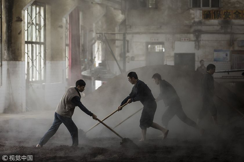 2018年10月29日,贵州茅台以跌停收盘,这是上市17年来的第一次。今年第三季度,以茅台为代表的高端酒增速下滑。图为贵州茅台镇,贵州茅台酒厂的员工们在发酵前将蒸熟的高粱摊开冷却。