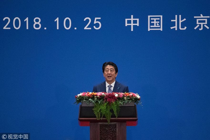 2018年10月25日,北京,日本首相安倍晋三出席纪念中日和平友好条约缔结40周年招待会并致辞。此访是时隔七年日本领导人再次访华,在中美贸易战的背景下,人们期待中日关系回暖。