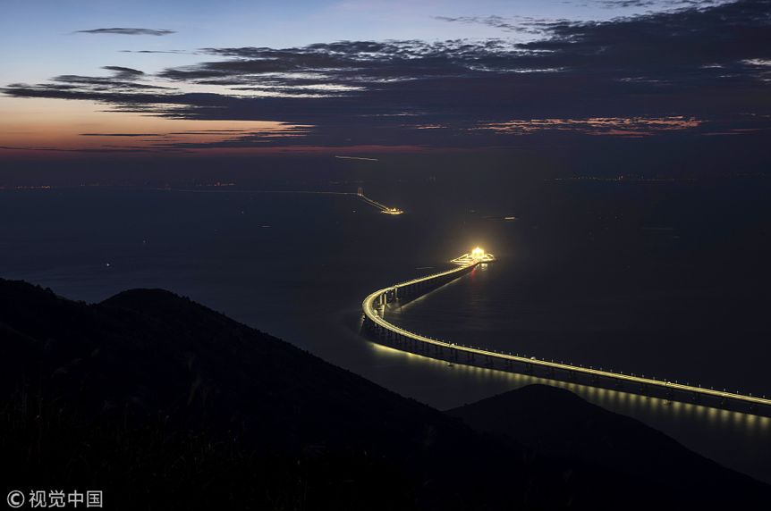 2018年10月21日,香港,耗资一千多亿元人民币、长达55公里的港珠澳大桥上,人工岛在暮色中被点亮。