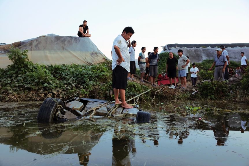 2018年8月21日,山东潍坊,寿光受台风“温比亚”影响,18、19日多地连降暴雨造成弥河流域上游冶源水库、淌水崖水库、黑虎山水库接近或超过汛末蓄水位,入库流量远超出库流量,洪水淹没下游村庄。图为8月24日,山东寿光。东里村村民刘振刚站在被洪水冲走的轿车上在为如何把车拖到陆地上发愁。(摄影:吕萌)