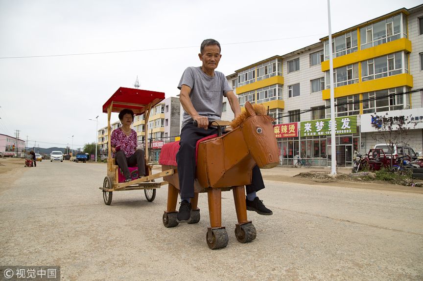 2018年8月28日,吉林省永吉县西阳镇大岗子村,68岁的农民李景阳骑着自己发明制作的电动小马车拉着老伴刘玉琴上街,引来大人孩子争相乘坐。