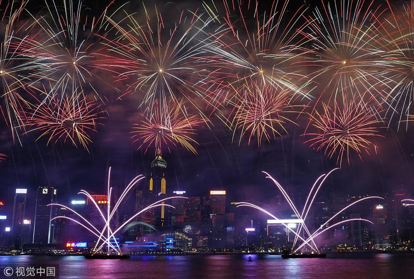 2018年10月1日,香港国庆烟花汇演在维多利亚港举行。此次烟花汇演以“团结共融”为主题,包括“黄河奔腾”、“缤纷人生”、“梦想光芒”以及庆祝改革开放40周年的压轴表演“再创辉煌”等八幕,持续约23分钟,共燃放31888发烟花。