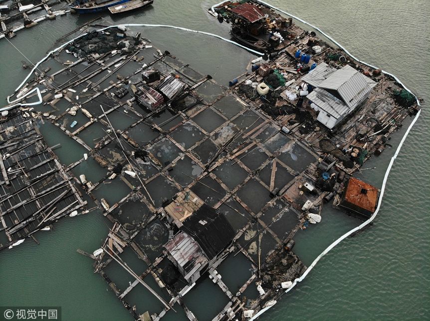 2018年11月9日,福建泉州,泉港肖厝村,鱼排里的油污还没有被清理。11月4日凌晨,福建省东港石油化工实业有限公司执行碳九装船的宁波—天桐1#船舶与码头连接软管处发生泄漏。11月25日,泉州市人民政府召开新闻发布会,通报称实际裂解碳九泄漏量约为69.1吨,而非上报的6.97吨。