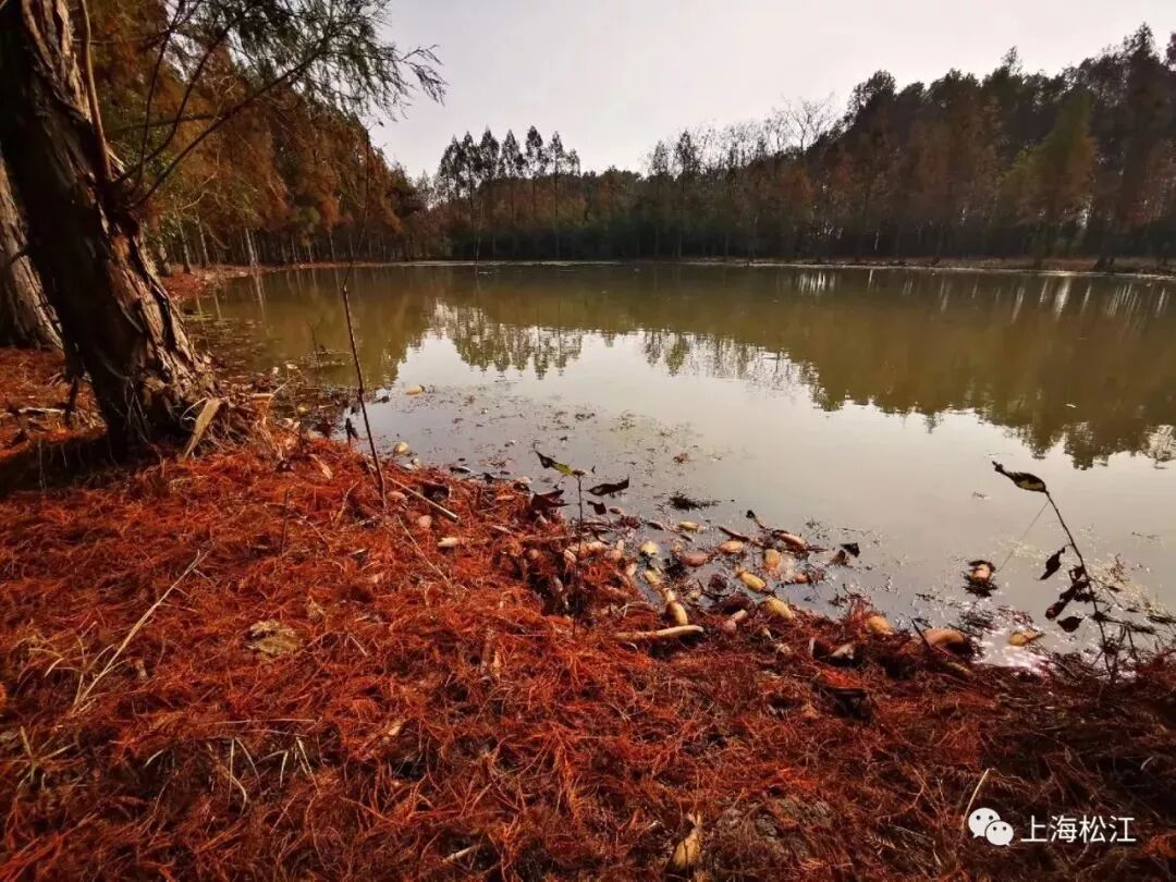 要看涵养林,最好能从路边的小道走进来。道路两旁半是有氧绿,半是水杉红。若是能凑上一个晴天,橘红色的树林分外好看,就像一场奇遇。围着水塘偶尔还能遇上惊喜,碰上一支半截的藕,等到夏日,接天莲叶无穷碧,诗里的奇妙景象也能看到。