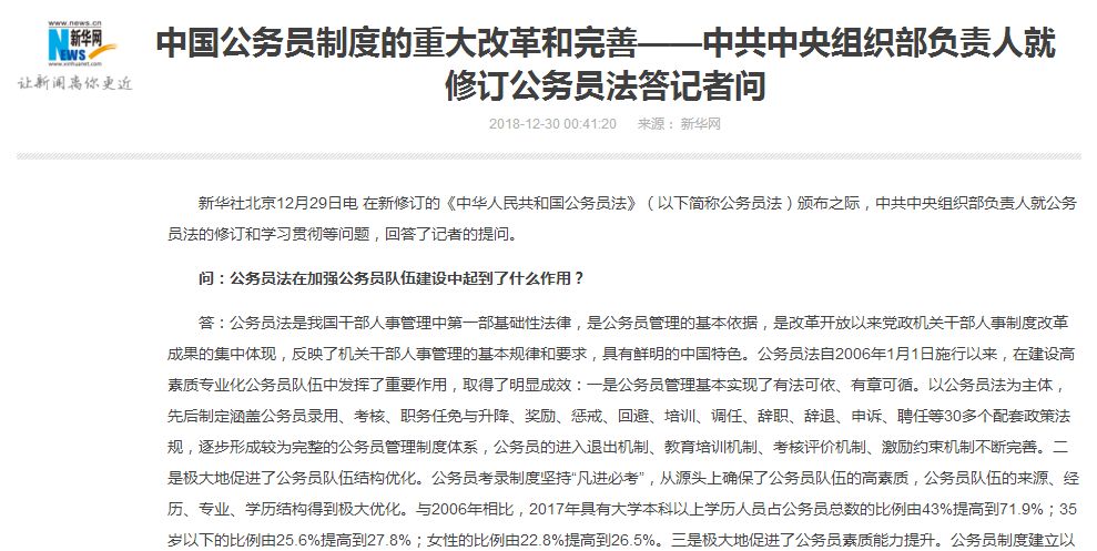 12月30日午夜,新华社发布中组部负责人就公务员法修改的权威解读,新修订的公务员法由原来的18章107条调整为18章113条,增加6条,实质性修改49条。