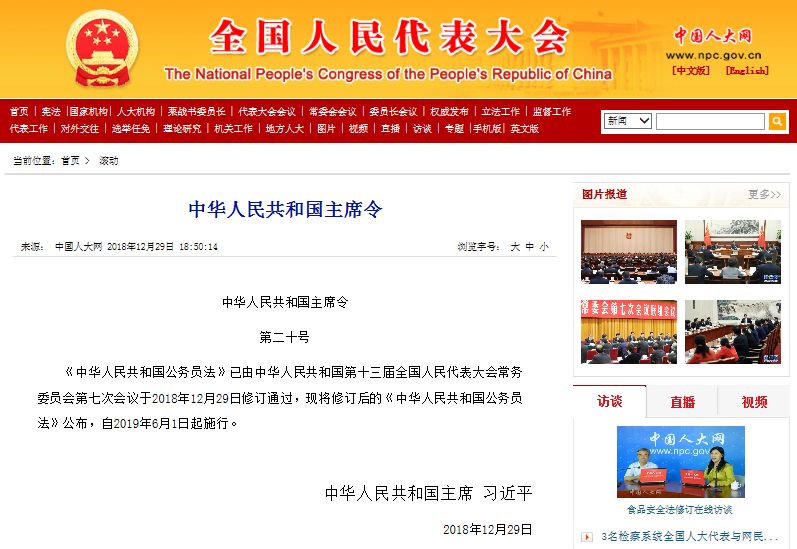 - 12月29日,第十三届全国人民代表大会常务委员会第七次会议审议通过了《中华人民共和国公务员法(修订草案)》,国家主席习近平颁布第20号主席令,宣布修订后的《中华人民共和国公务员法》自2019年6月1日