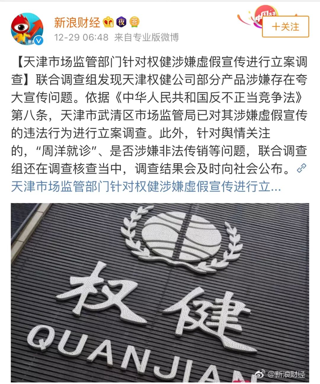 12月29日,新浪财经官博发文称:【天津市场监管部门针对权健涉嫌虚假宣传进行立案调查】联合调查组发现天津权健公司部分产品涉嫌存在夸大宣传问题。依据《中华人民共和国反不正当竞争法》第八条,天津市武清区市场监管局已对其涉嫌虚假宣传的违法行为进行立案调查。