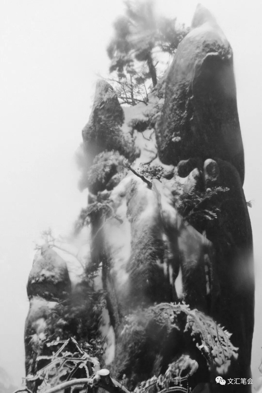蒲团石上观天都峰雪景