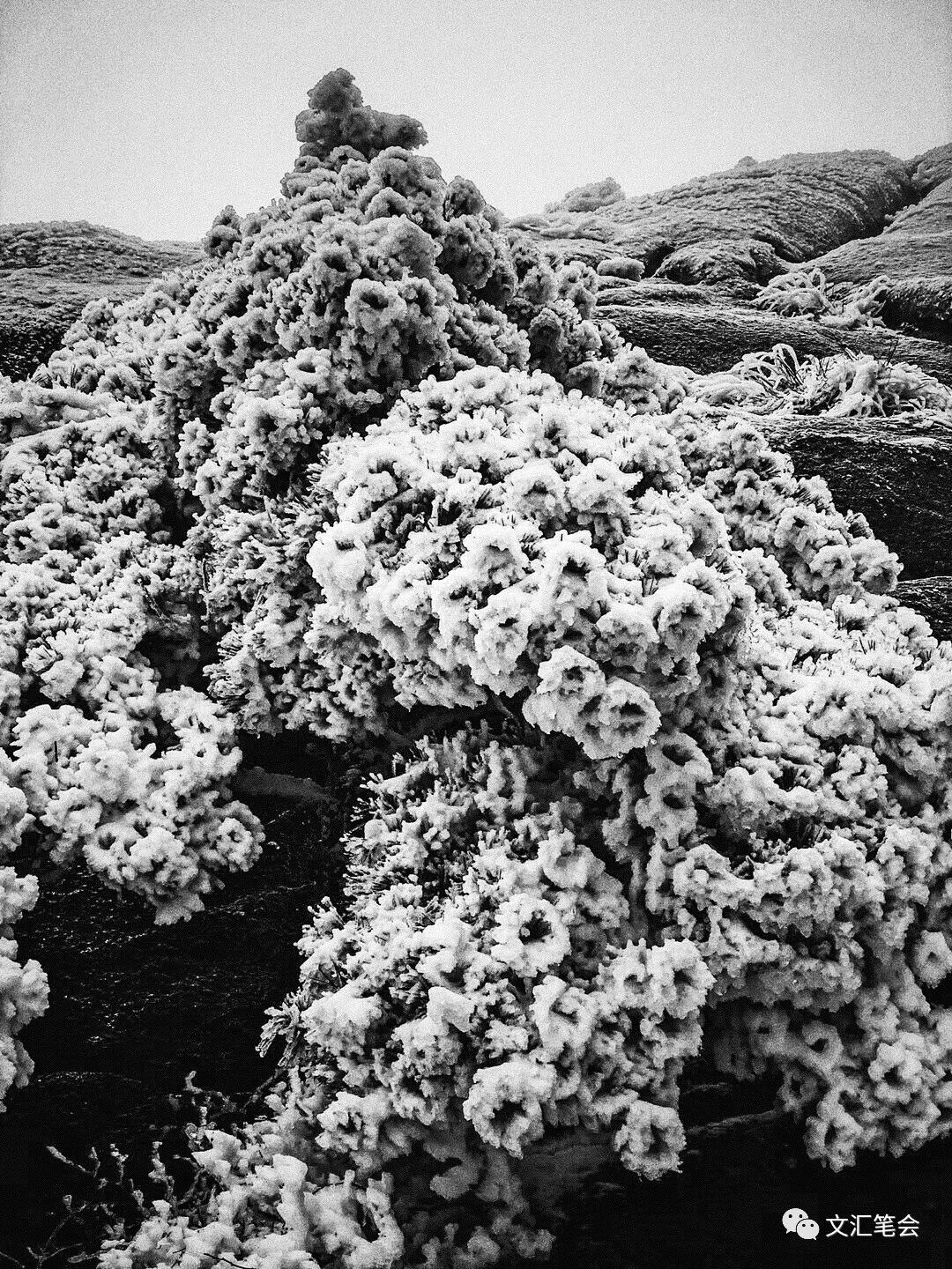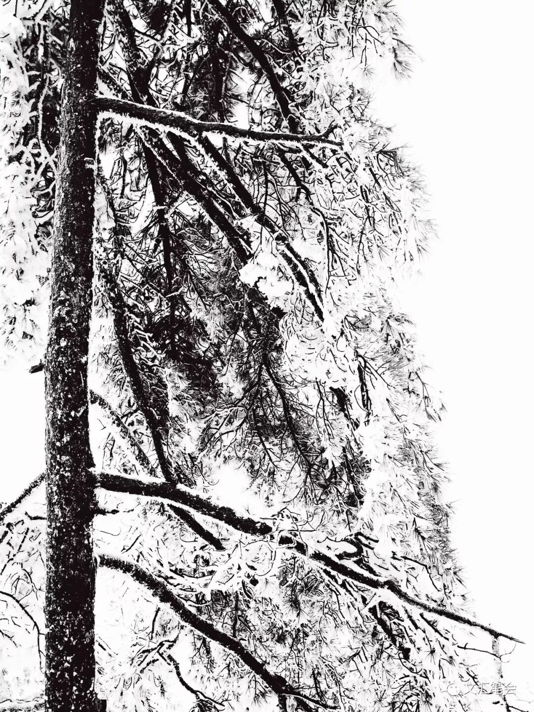 自慈光阁徒步登山,游人少,翻以为快。不多时,大雨夹雪,以面受雨,身心疲惫。看到天都峰以下积雪陆续融化,更是心中叹惋,害怕遇上“游非其时”的“大败兴事”。天都峰因大雪封山,不能攀登。纷纷山雨中大雾弥漫,虽爬至最佳观天都峰处——蒲团石上,却不见雪后峰峦,来前的各种遐想顿时落空。好在沿蒲团石绕至蓬莱三岛,眼前出现了奇观。大雨虽不止,而此处积雪却不动声色地伏在岩上、树上,与天都峰前景截然不同。挂壁植被皆为积雪所盖,近观之才发现为松树,而远望似如海底珊瑚世界,只是颜色尽白罢了。山中除陡壁处皆为积雪所盖,世界颠倒了黑白。此时的蓬莱三岛,真如仙境。绕过迎客松和玉屏峰,至大雾弥漫的莲花峰脚下,此为黄山三十六峰最高峰,至今已封山五年,明年四月始对外开放。前方之百步云梯因陡峭路滑而封锁,我们从莲蕊峰绕道经鳌鱼洞,来到我们夜宿的白云宾馆。时已近下午三时,大雨未止,全身湿透。略作休息,我们再绕至西海大峡谷口,沿路矗立着株株白雪覆盖的松树。