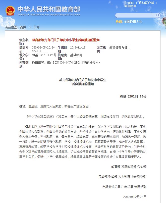 - 近日,《中小学生减负措施》(减负三十条)出台了! 这份文件经国务院同意,由教育部、国家发展改革委、公安部、民政部、财政部、人力资源社会保障部、国家市场监管总局、国家广播电视总局、全国妇联等九部门联合