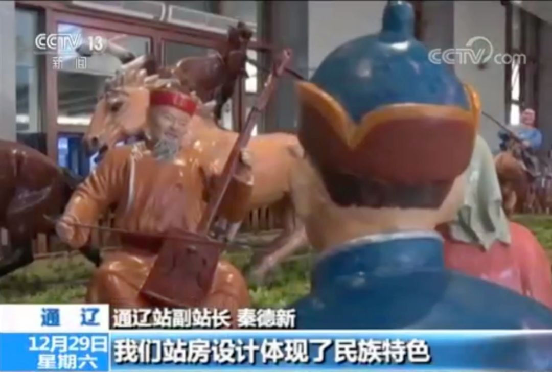 我们的站房设计体现了民族特色,首先从房体(上看),我们设有蒙古包,室内我们还有蒙古族的各个生活场景,在我们的隔断当中给予体现,安检之后我们还有吉祥科尔沁群雕。