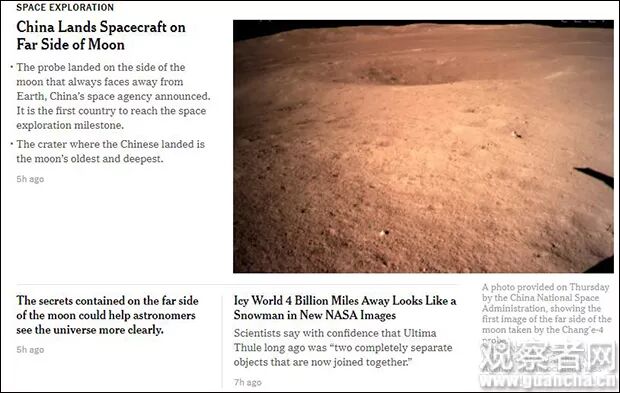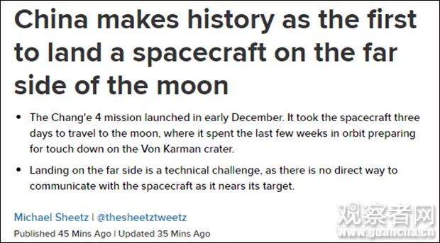 CNN则指出,中国是继美国和俄罗斯后,第三个实现登月的国家,但此次着陆是人类太空探索领域的一个“里程碑”。